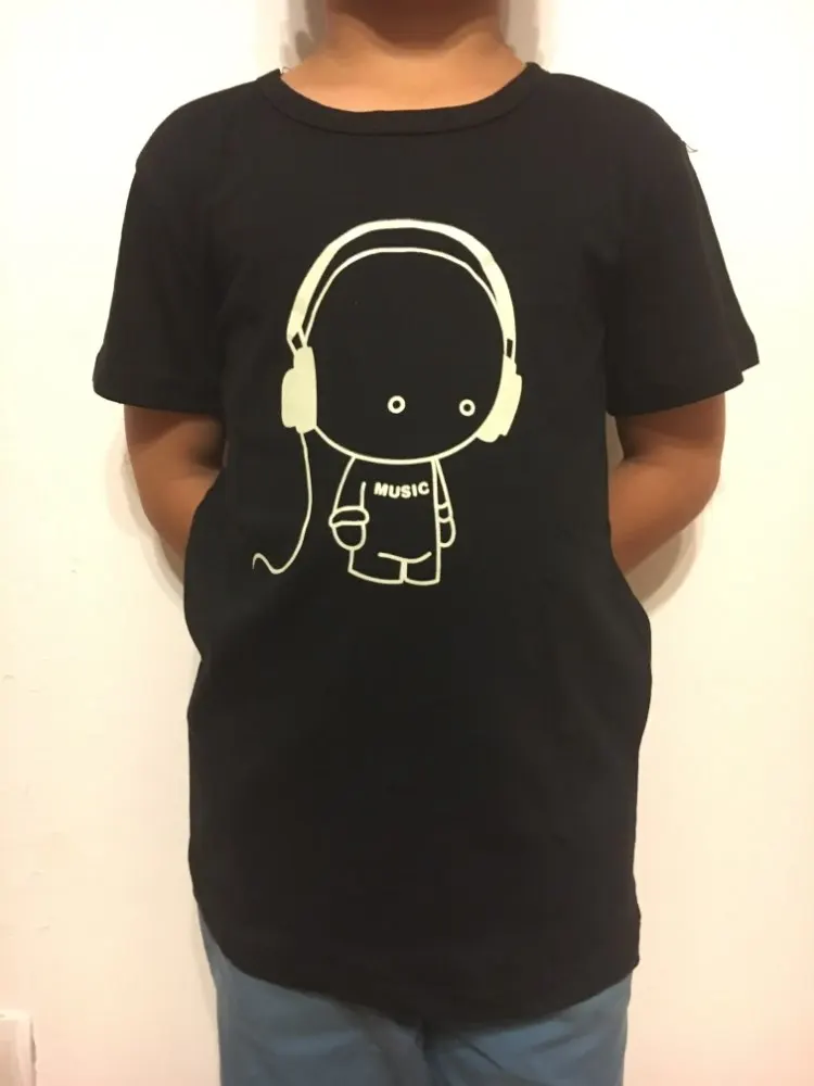 The figure on the T-shirt is applied with a special luminescent paint. In the light, the image accumulates energy, and in the dark gives energy in the form of a luminous pattern. This T-shirt is suitable for both children and adults.